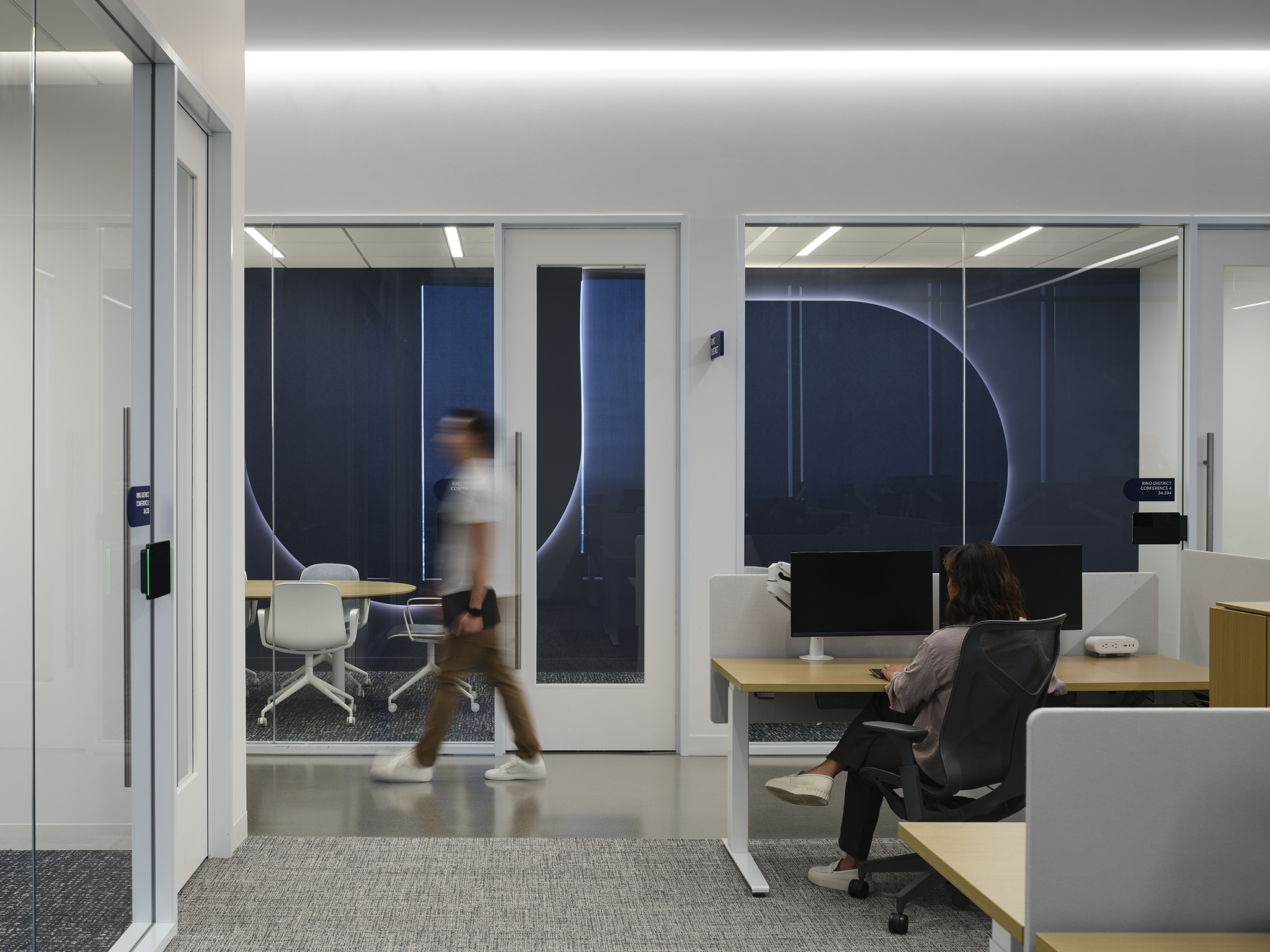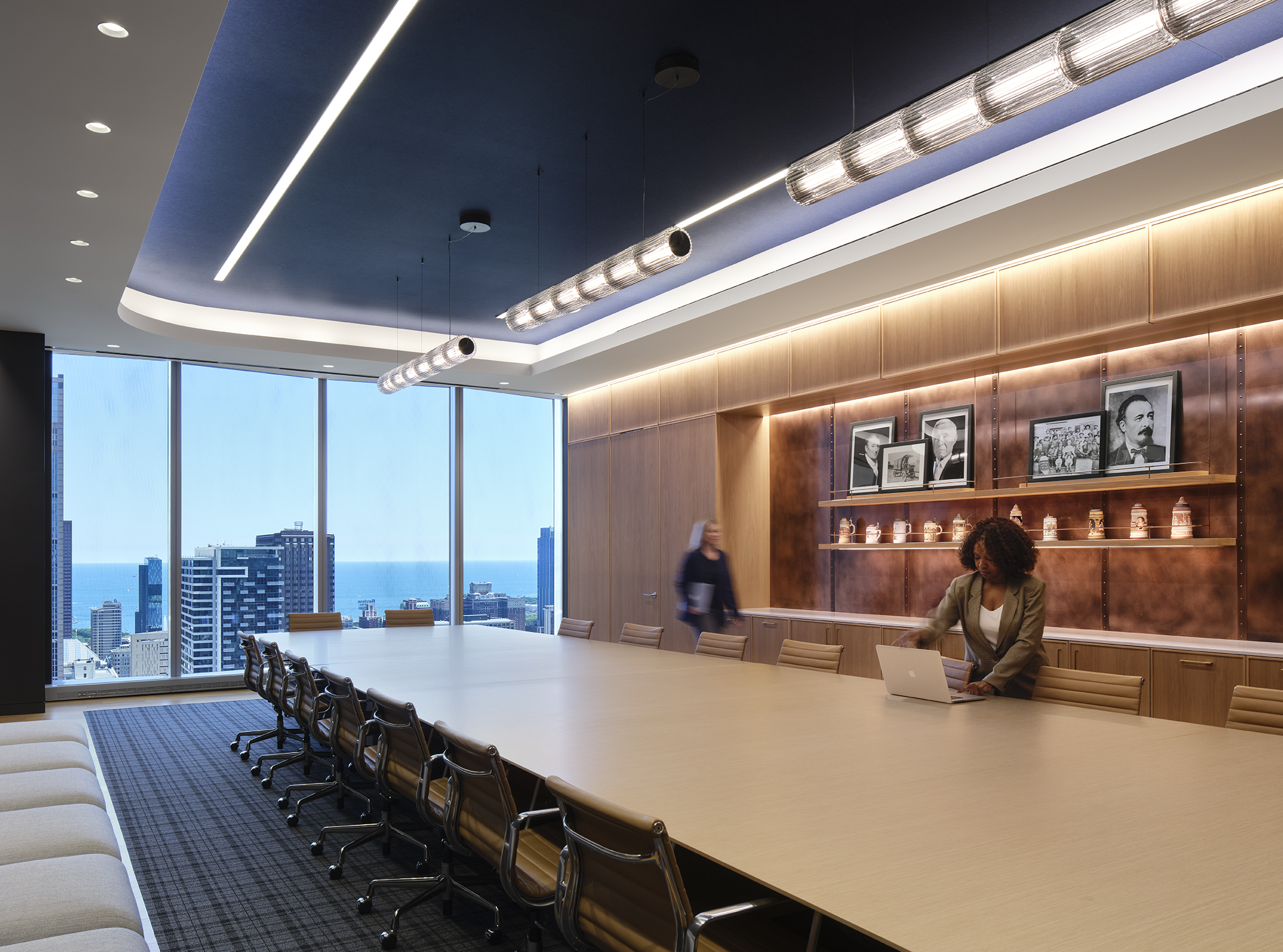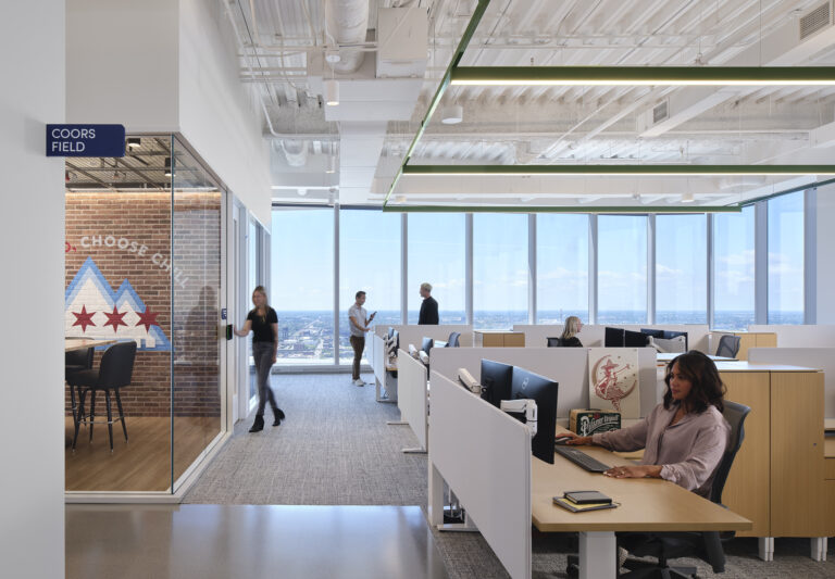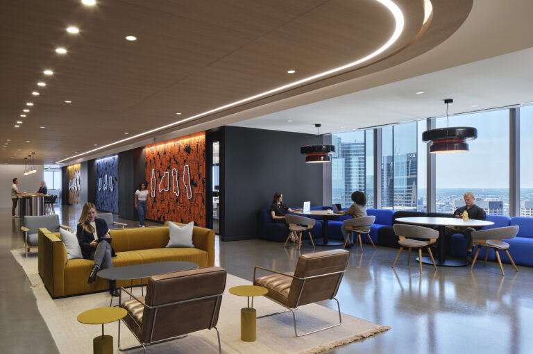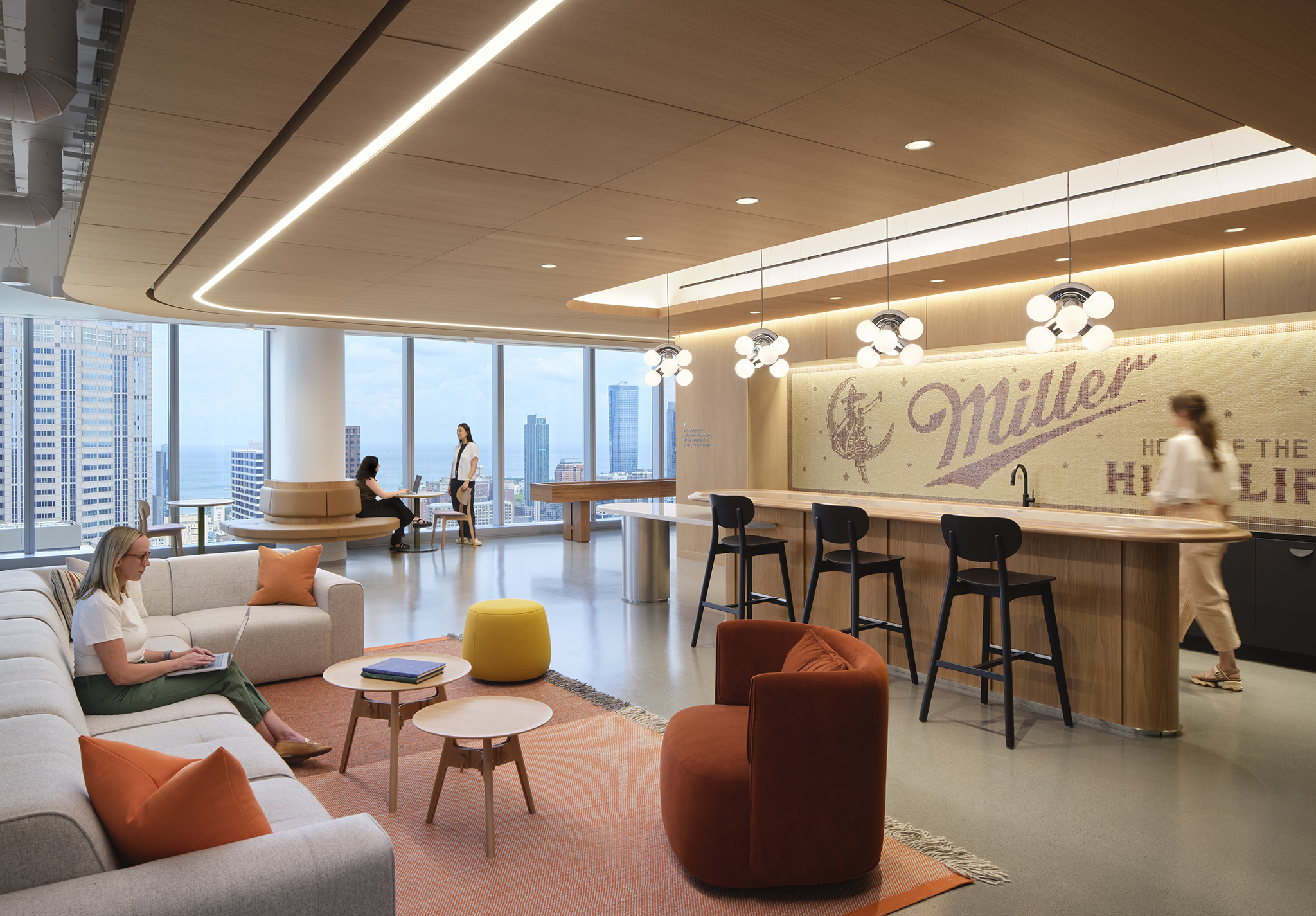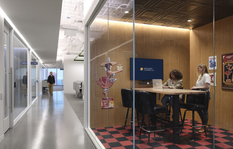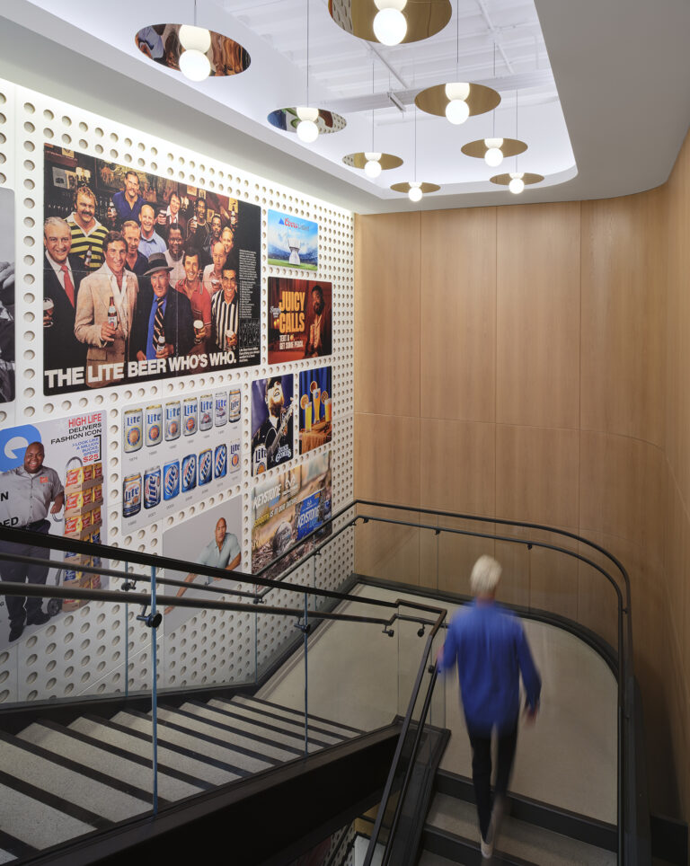 The interior of Molson Coors’ Chicago headquarters is a one-of-a-kind experience in balanced design. Through considerate design and careful integration, our team illuminated the workplace with a variety of unique fixtures, creative lighting strategies, and mood-setting color temperatures. Visible throughout the space, a suspended acoustical panel system features a custom curved linear fixture, which we installed through a delicate collaborative process. More hospitality-focused zones, such as the bar, offer seating within a warm glow, with sconces held in bespoke GGLD-designed wall brackets for an upscale experience. Images on the soaring wall of the feature stairwell are lit with complex layers of lighting, which required comprehensive mock-ups to perfect before installation. In a large-scale mechanical undertaking, the GGLD team built out a custom suspended Unistrut system with integrated fixtures for the open-plan office. Conference rooms feature engaging touches, such as back-lit panels with adjustable local controls. The result of this thoughtful attention to detail and enthusiastic collaboration with the architect and client is a workplace that’s equal parts corporate comfort and enthusiastic brand representation.